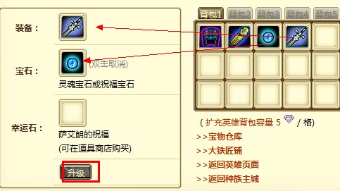 将宝石和装备拖动至左侧的空格中,点击“升级”按钮就可以完成任务了。